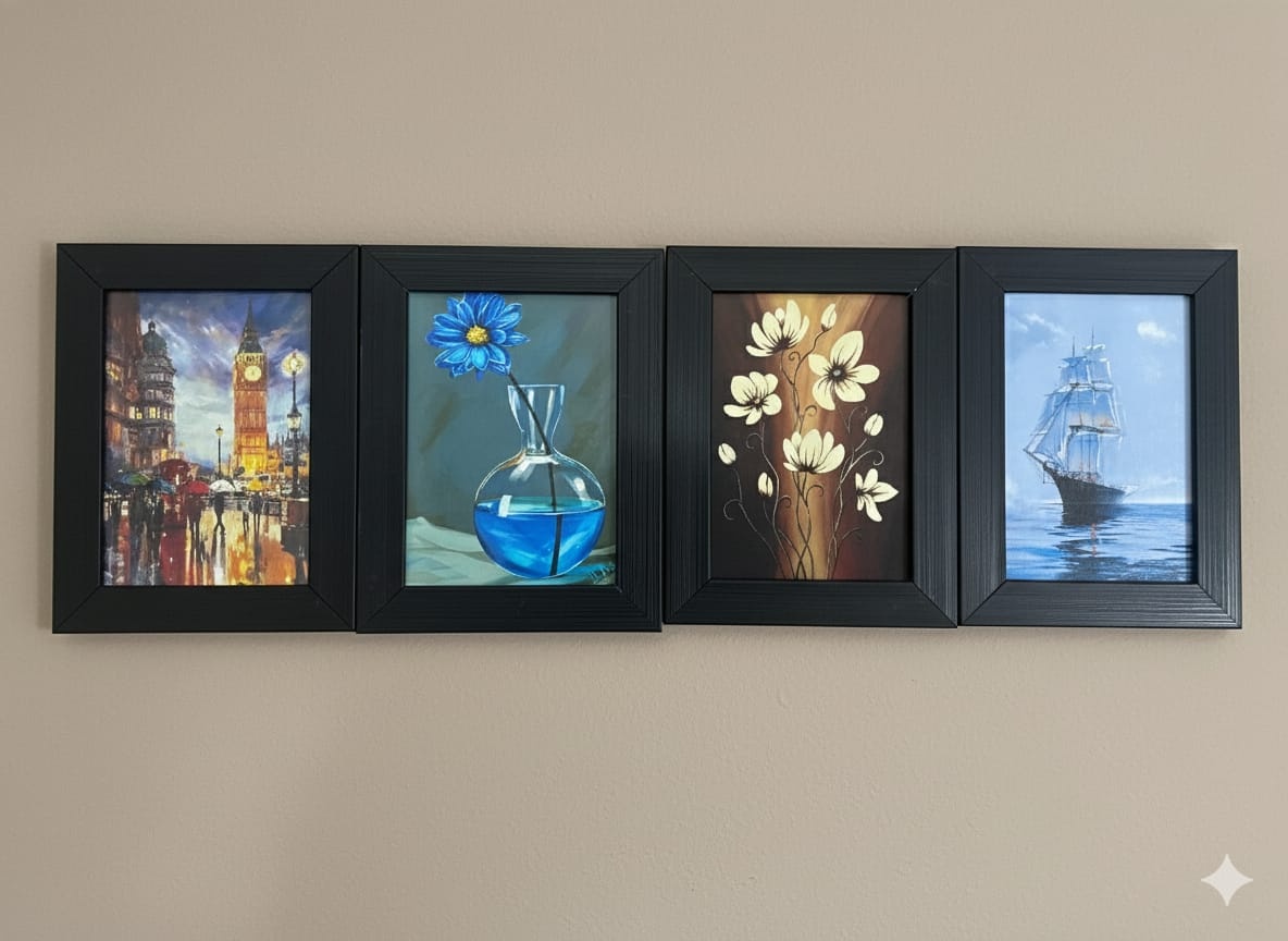 • Each frame has a unique artistic style (city, floral, vase art, ocean theme)