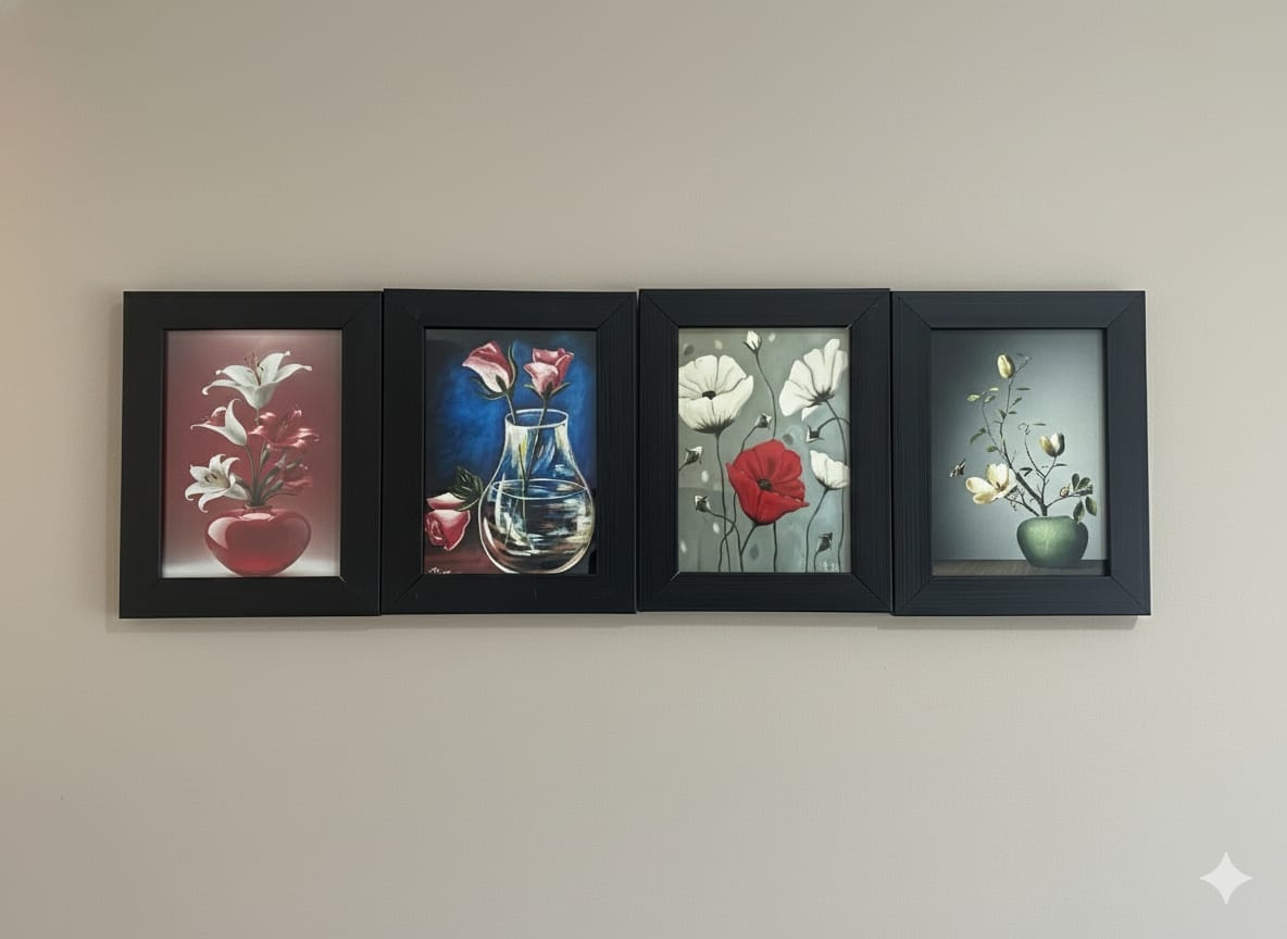 Bring nature’s charm indoors with this beautifully curated set of four floral paintings, each capturing a unique arrangement and mood. From the bold elegance of white lilies in a red vase to the soft romance of pink blossoms, this collection offers a harmonious blend of color, texture, and botanical beauty.