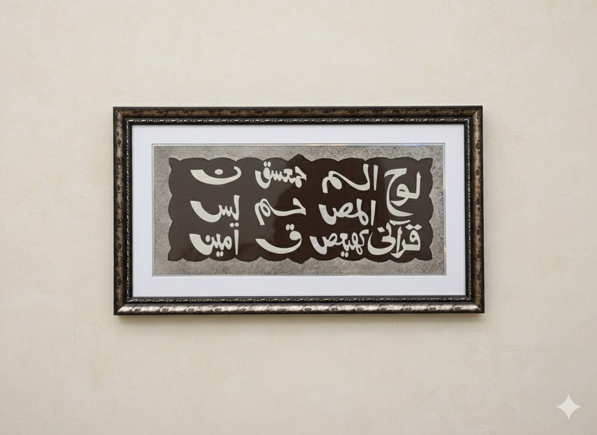 Add a touch of spiritual elegance to your space with this beautifully framed piece of Arabic calligraphy. The artwork features flowing white script set against a rich dark brown background, creating a striking contrast that highlights the beauty of the Arabic language.
